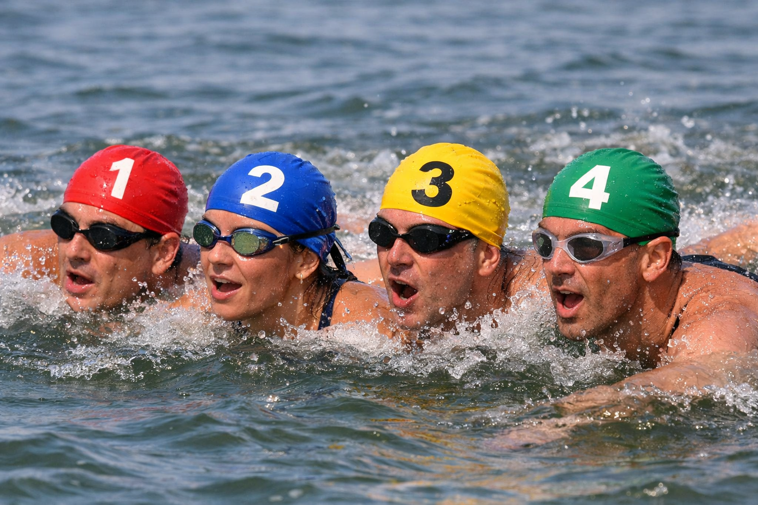 De eerste zwemmer zwemt 1 km. Daarna sluit zwemmer 2 aan. Na deze lus komt zwemmer 3 erbij. In de laatste lus is het aan zwemmer 4. In totaal dus per team 4+3+2+1 = 10 km